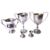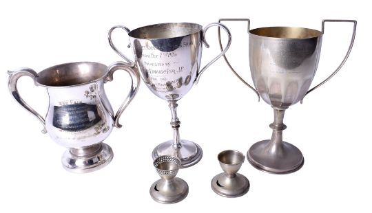 A collection of silverplated trophies. Including a twin-handled example engraved 'Tor Fair, 1925, best pair of foals', H29cm, etc.