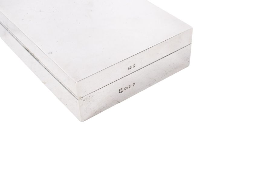 A hallmarked silver cigarette box and a group of mother of pearl handled cutlery. The box undecorated, with wooden interior, Page Keen & Page, hallmarked London 1939, H3.1cm x W12cm x D8.9cm, this gross weight 333.5g, together with five similar assorted forks and five knives, with white metal collars and mother of pearl handles.