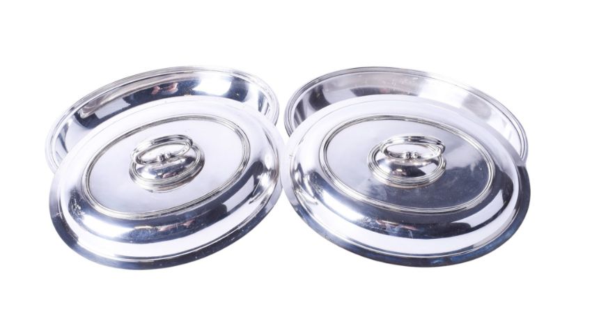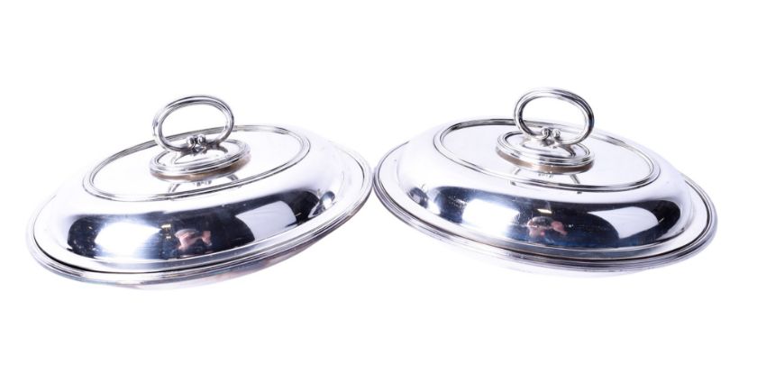 A pair of silveplated entree dishes and covers. Of oval form, with a moulded edge and scrolling handles, H13cm.