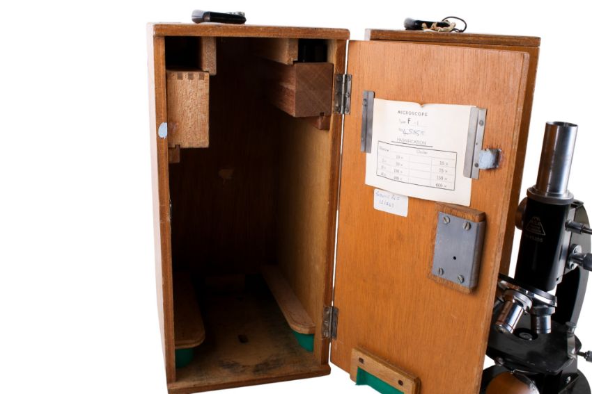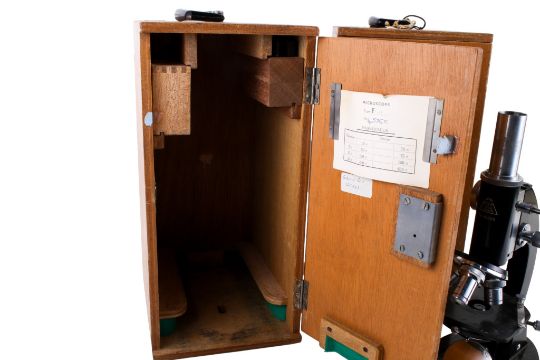 Two circa 1960s school microscopes in wooden cases. By ASA, Tokyo, S/N 45355 and 47356. H36cm x W17cm x D21cm