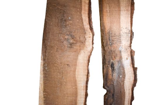 Two long seasoned planks of wood. With live edges, largest L257cm.