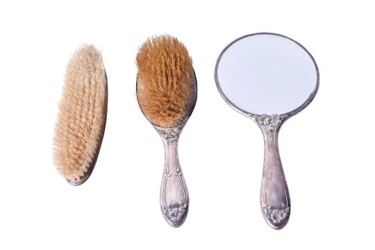 An early 20th century silver backed dressing table set. Comprising two brushes and a mirror, all having embossed floral decoration.