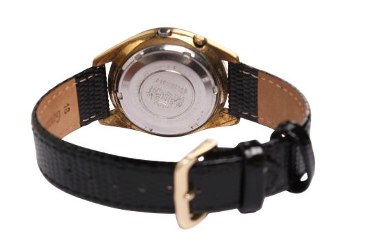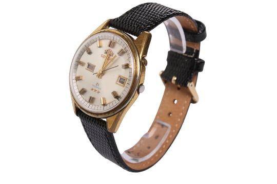 A gentleman's Orient 21 'Swimmer' automatic day/date wristwatch. The chrome dial with baton hour markers and day and date aperture, in a gold plated case with an embossed stainless steel back, case diameter 3.8cm, attached to a black leather strap.