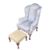 A high wing back armchair and a footstool. The armchair upholstered in blue jacquard fabric and raised on cabriole supports. H128cm, the footstool upholstered with green fabric, H33cm.