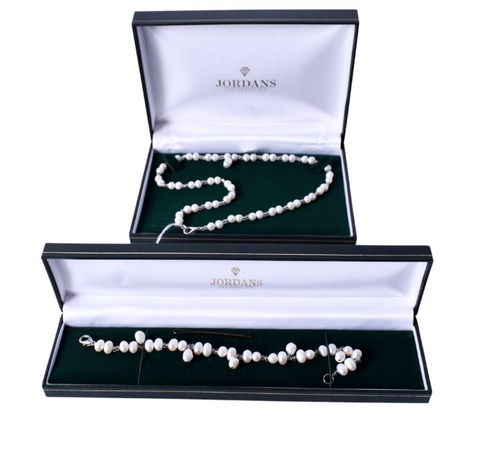 A matching cultured pearl necklace and bracelet. The double pearls interspersed with silvered beads, white metal clasps, necklace L43cm, bracelet L19.5cm, boxed.