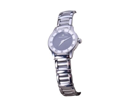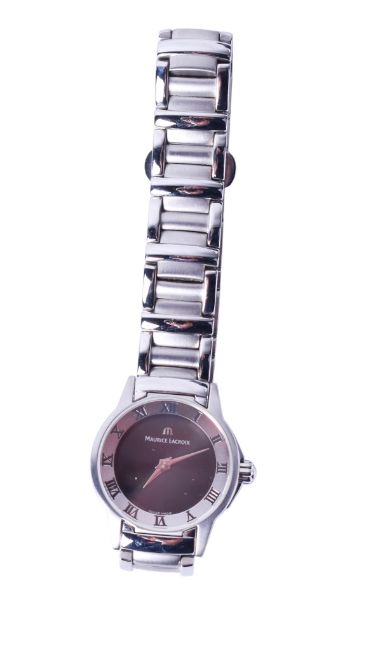 A lady's Maurice Lacroix wristwatch. The black dial surrounded by a stainless steel bezel with Roman numerals, in a stainless steel case with bracelet strap, dial diameter 2.5cm, in the original box with the outer case.