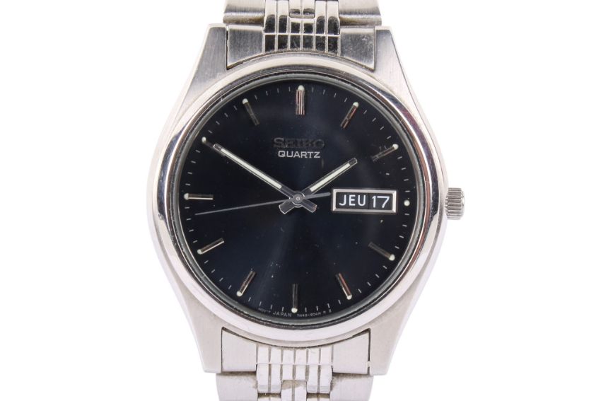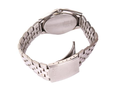 A gentleman's Seiko wristwatch. Quartz movement, the grey dial having chrome baton hour markers and a day/date aperture, in a stainless steel case with a bracelet strap, dial diameter 3.5cm