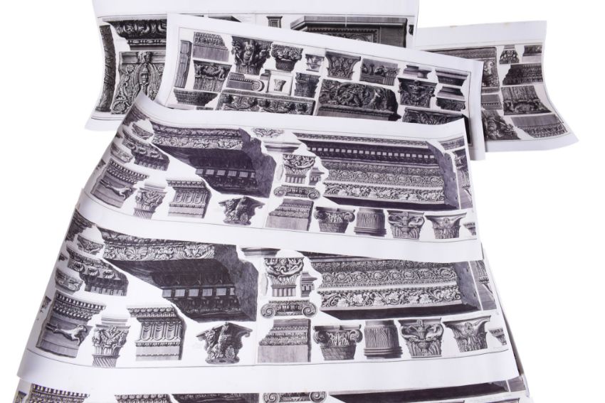 A collection of prints depicting architectural components. Including columns, ancient Greek and Roman carvings, etc. some signed and designed to be joined together, 54cm x 113cm.