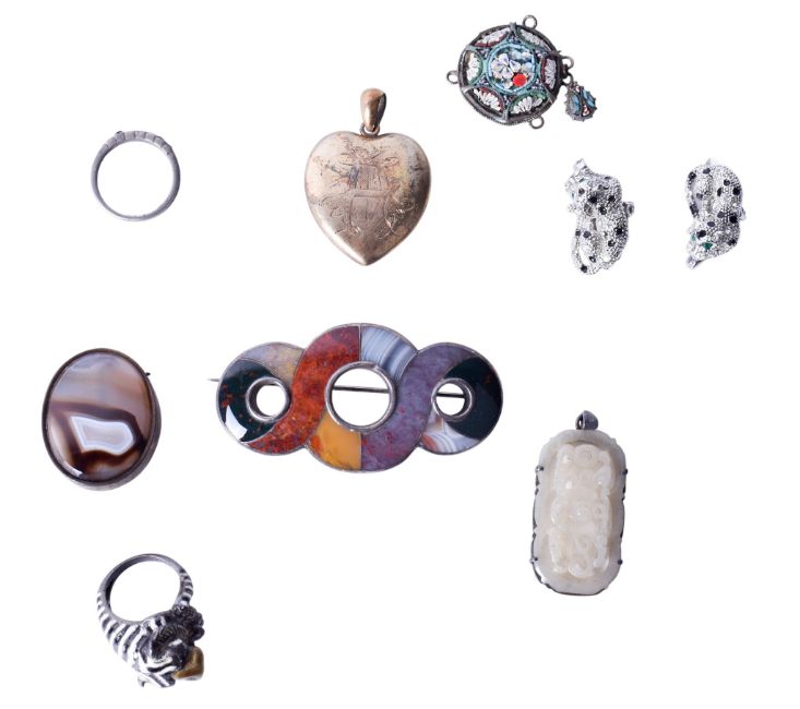 Silver bangle is tarnished but no obvious knocks. MIcro-mosaic is missing some pieces, ring is missing some stones. Some rubbing and knocks to the heart pendant. Necklace is in good condition. Earrings in good condition. Both brooches and the pendant show tarnishing to the metal but no chips to the stones. Enamel ring has some chips and losses. Bracelets are slightly tarnished but overall in good condition. SOme pieces show wear and scratches consistent with age and usage. No obvious repairs.