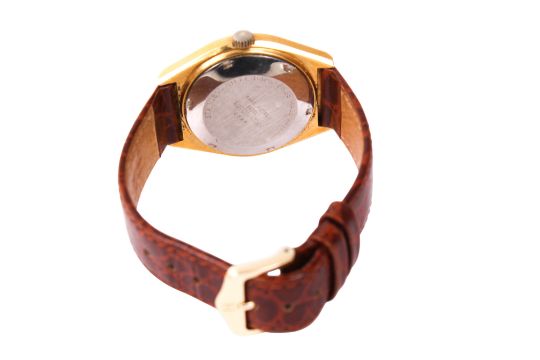 A gentleman's vintage Swiss Emperor wristwatch. 25-jewel movement, the gilt dial with baton hour markers and a day/date aperture, in a gilt metal case, case diameter 3.5cm, attached to a brown leather strap.