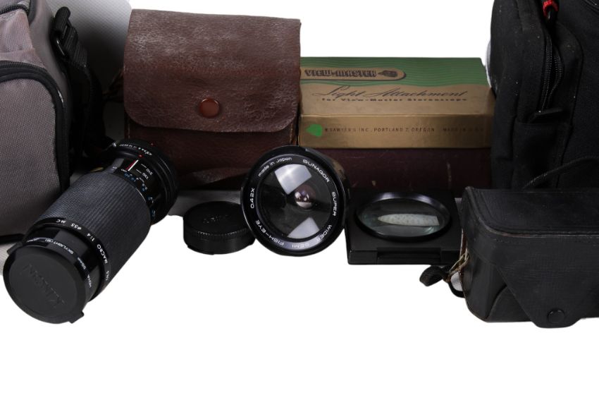 An assortment of cameras, lenses and photographica. Including a Kiron 70-210mm f/4.5, boxed View-Master Light Attachment Stereoscope, Kodak Instamatic 204 camera, etc.