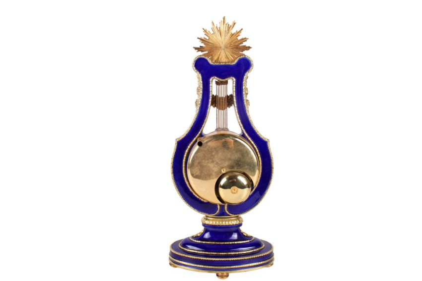 A V&A 'Marie-Antoinette Clock and key. Gilt and blue glazed porcelain, cream dial with Roman numerals striking to a bell. H39cm