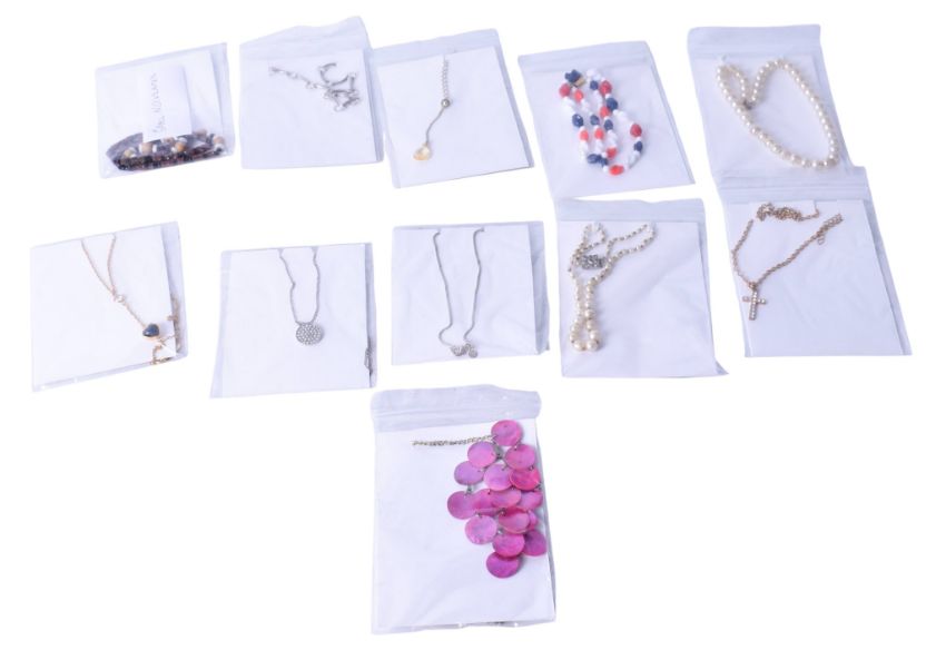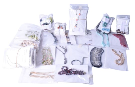 A large collection of costume jewellery. Including beaded necklaces of glass, faux pearls, shells, etc, bracelets earrings and brooches, all in packets.