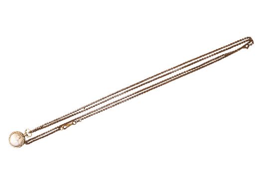 A yellow metal photograph pendant on a gold plated chain. The pendant with scroll border and patterned back, unmarked, this weighing 5.2g, on a long chain.