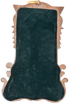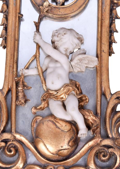 A reproduction Rococo style wall mirror. Featuring a cherub mounted in a scrolling gilt frame, H47cm.