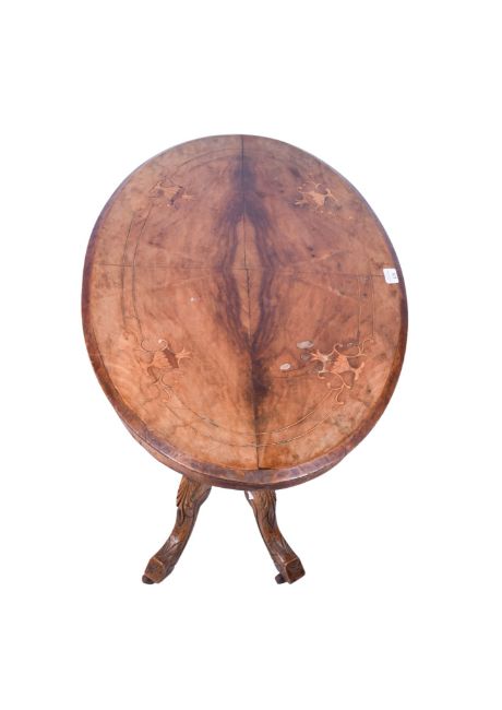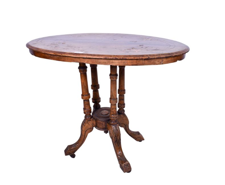 A Victorian oval inlaid quarter veneered centre table. Having a moulded top, on four turned columns with four carved supports, raised on casters. H70cm x W88cm x D55cm