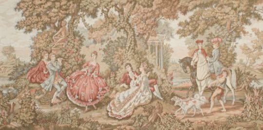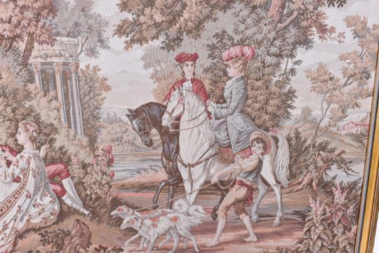 A large French rococo style machine made tapestry. Depicting figures in a classical garden. 198cm x 99cm. Framed.