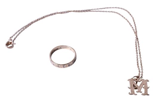 A 9ct gold ring and a yellow metal 'M' pendant and chain. The ring set with small colourless stones, hallmarked, gross weight 2g, the pendant and chain unmarked, this weighing 3g.