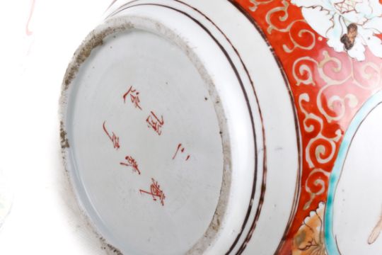 Two 19th/20th century Japanese and Chinese vases. The first Japanese, late 19th/early 20th century, of double gourd form, decorated with birds against a scrolling orange floral ground, H47cm, the second 20th century Chinese, of tapered form with floral decoration, H33cm. (AF) Condition Report: Chinese vase: rim possibly cut down. Some losses to the glaze and spots of pitting. No apparent cracks, chips.Japanese: previously broken and repaired. Areas have been re-painted and there is fading and flaking to the decoration. Some pitting to the glaze, hairline cracks and some small chips. Both pieces show signs of general wear including rubbing and scratches and would benefit from a clean.