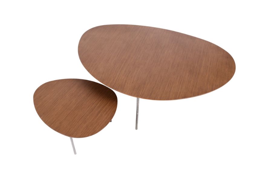 Two contemporary Stua Eclipse designed walnut coffee tables. Of asymmetrical form, raised on three metal supports. Max. H36.5cm x W110cm x D77cm
