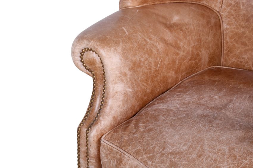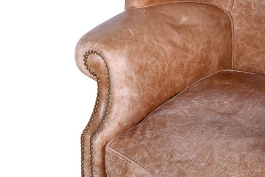 A 20th century wingback armchair. Having scroll arms, upholstered in brown leather with studded details, raised on tapered wooden supports terminating in brass casters, H113cm.