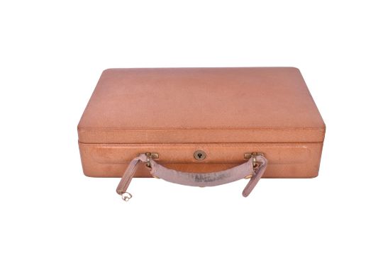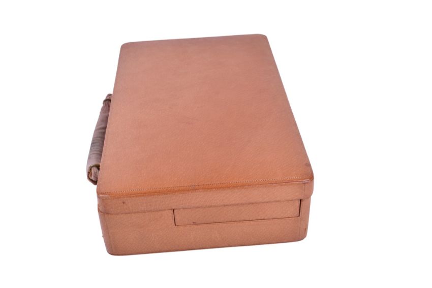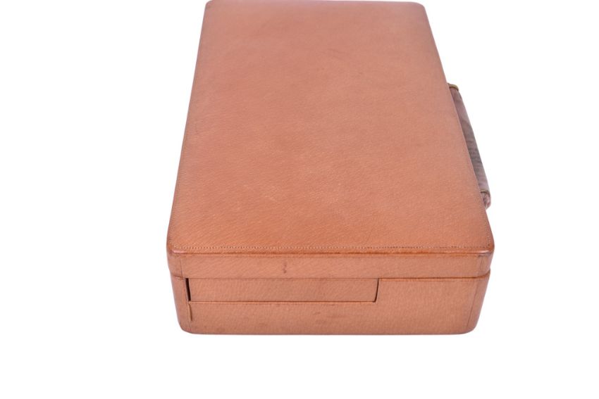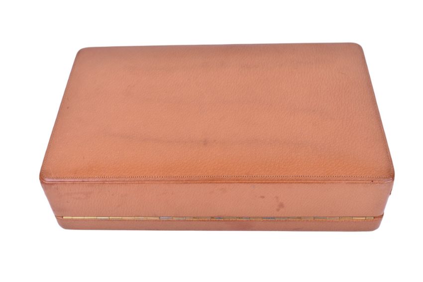 A vintage small brown leather case. Of rectangular form, having an outer cover, 20cm x 33cm, no key.