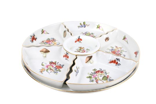 A Herend hand painted hors d'oeuvres serving dish. Having six sections on a stand. Diameter 37cm