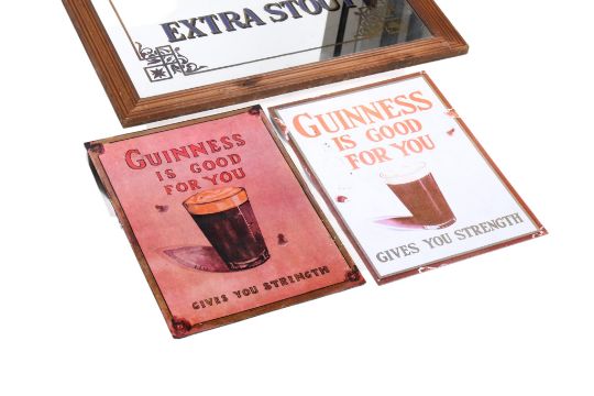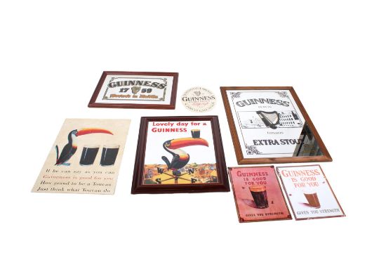 A collection of Guinness related advertising items. Including three bar wall mirrors, signs, etc.