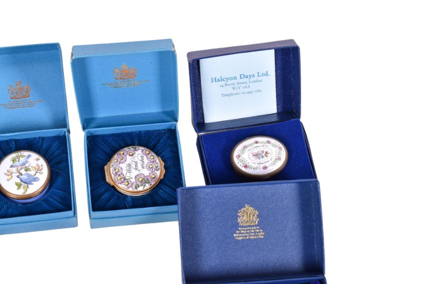 Eight 20th century Halcyon Days enamel trinket boxes. Mostly of circular and oval form, including one decorated with a horse racing scene and another celebrating Christmas 1998, five in the original boxes.