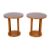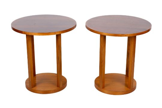 A pair of contemporary wooden coffee tables. The circular tops raised on square supports attached to a weighted circular base, H63.5cm x Diameter 60cm.