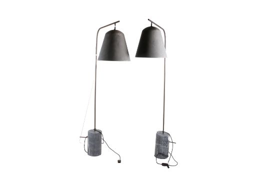 A pair of mid-century arc floor lamps with grey metal bell shades. Having heavy cylinder stone bases. H182cm