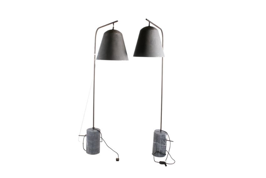 Overall in decent condition. Structurally sound. Would benefit from a clean. One of the lights has come out of its socket, the other is missing the wire cable extending through the hole. Untested whether functioning. Show signs of wear including marks and scuffs to the shade (possibly part of the design), and scratches and small chips to the bases. No obvious repairs or alterations. Not tested by auction room, sold as seen.