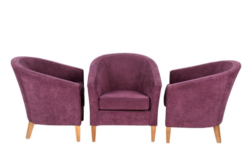Three tub chairs. Upholstered in purple woven fabric, raised on tapered square supports, H76cm
