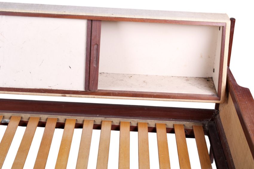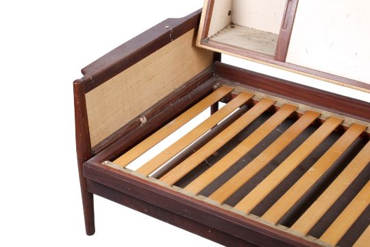 A mid-century teak Scandinavian style sofa bed, unbranded. Having an extendable seat, storage cupboards to the rear, raised on turned tapering supports. H76cm x W188cm x D79cm