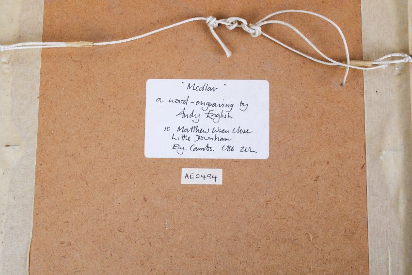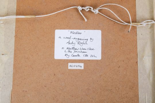 A group of three wood block prints. Including Andy English - 'Medlar', signed limited edition, no. 14/60, 11cm x 11cm, framed and glazed, 27cm x 33cm, etc.