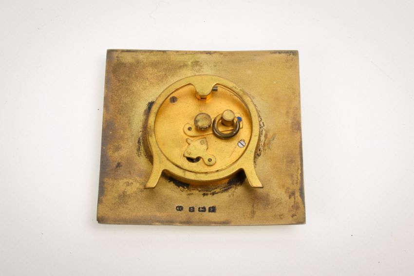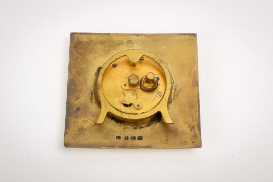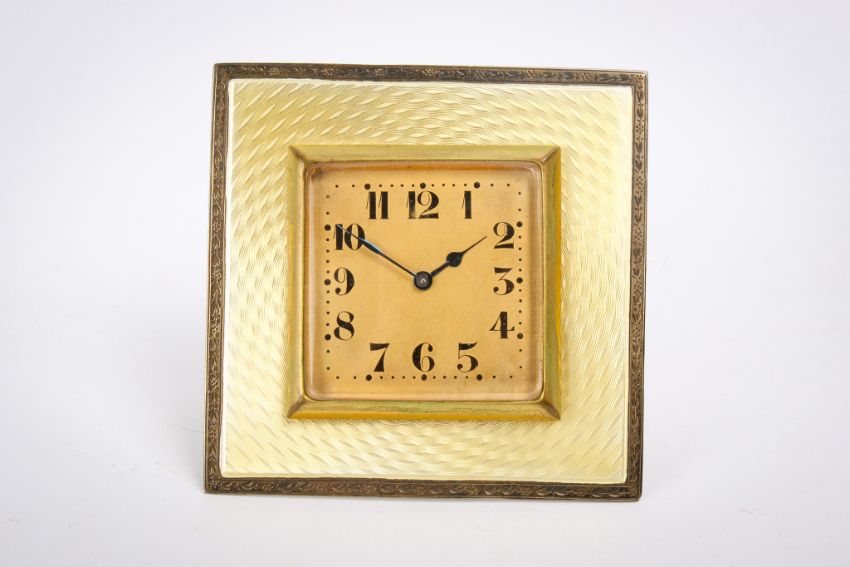 An early 20th century silver and yellow enamel trapeze clock. Of square form, with black Arabic numerals to the gold face, guilloche yellow enamel within an engraved gilt border, the gilt back with hallmarks for Albert Carter, Birmingham, 1923, H7cm x W7cm, gross weight 113.6g.