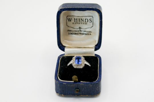 A blue (possibly synthetic spinel) and colourless stone ring. The central stone circa 7mm x 4mm, within a halo of colourless stones, shank marked 9ct & silver, size S, gross weight 2.6g.