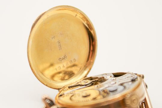 Hallmarked inside back case and side of case. Illegible mark?/word to strap.