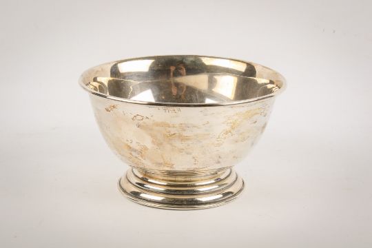 A Mexican sterling silver rose bowl. Undecorated, over a stepped foot, marked Conquistador, Sterling Mexico and a shield mark to the base, H9cm x diameter 16cm, weight 332.1g.