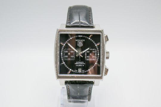 A Tag Heuer Monaco gentleman's stainless steel wristwatch, in the original box. Having a black square dial, two subsidiary dials and a date aperture, s/n CAW2110 EBB5454, on a black leather strap. Case measurement 39mm across