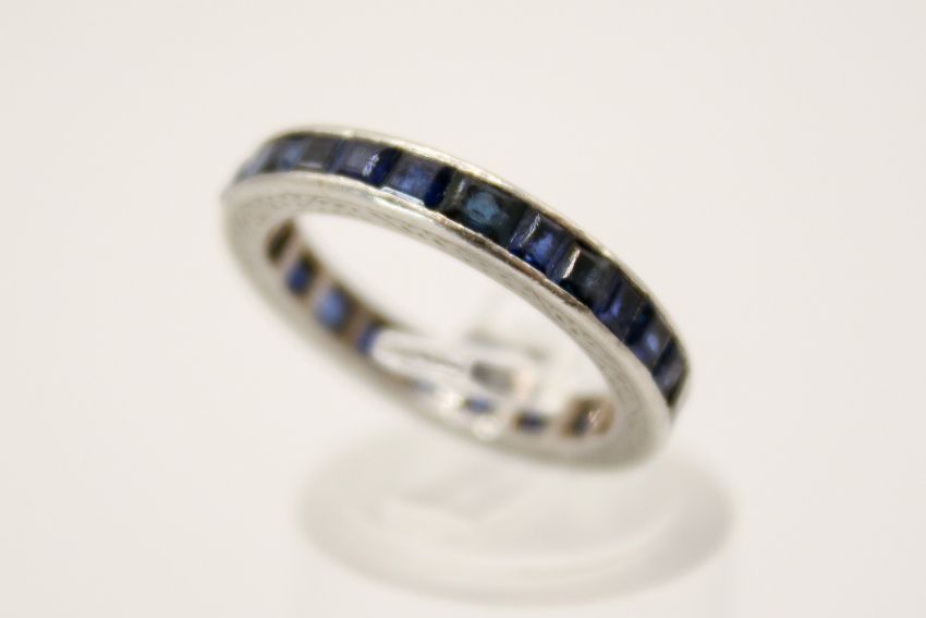 A sapphire eternity ring. With twenty channel square cut sapphires, circa 1.4ct gross estimated weight, metal unmarkd (probably platinum), size N, gross weight 4.4g.