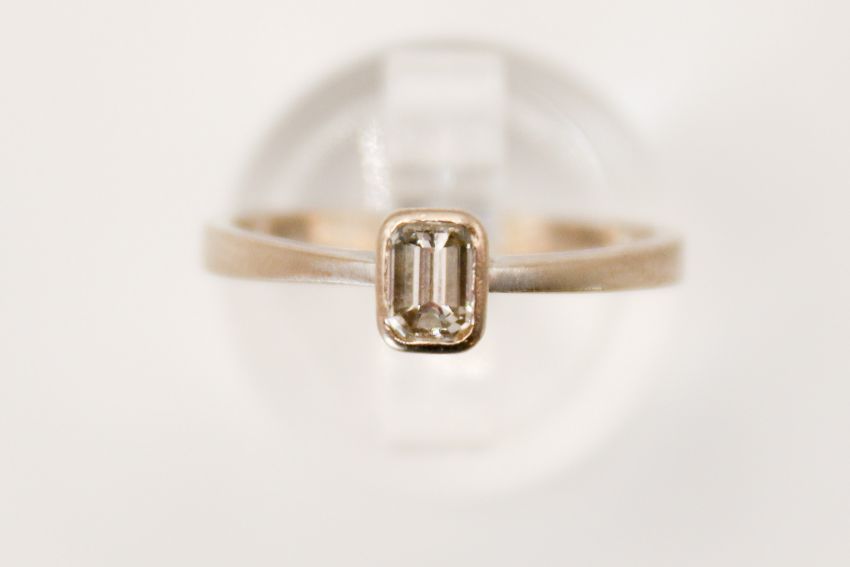 An 18ct gold and diamond solitaire ring. Of emerald cut type form, circa 3.2mm x 4.5mm, hallmarked, size M, gross weight 2.74g.