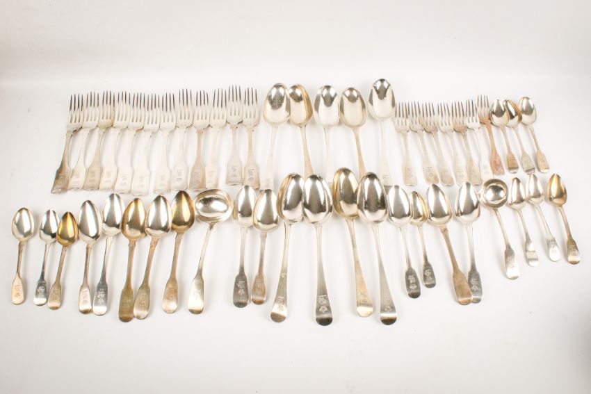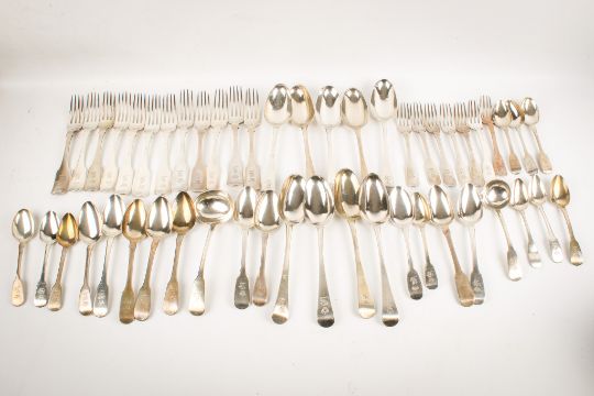 A large quantity of Irish and English matched silver cutlery. Comprising nine large spoons (Christopher Haines, Dublin 1772); seven dessert spoons (Dublin 1829, rubbed maker's mark): three slightly smaller dessert spoons (TB, London 1810); twelve large forks (Arthur Murphy, Dublin 1808); seven small forks (Dublin 1829, rubbed maker's mark TF/TT); ten matched Georgian and Victorian Irish teaspoons; and two small Dublin ladles, . All with engraved crown over dragon. Gross weight 2591g.