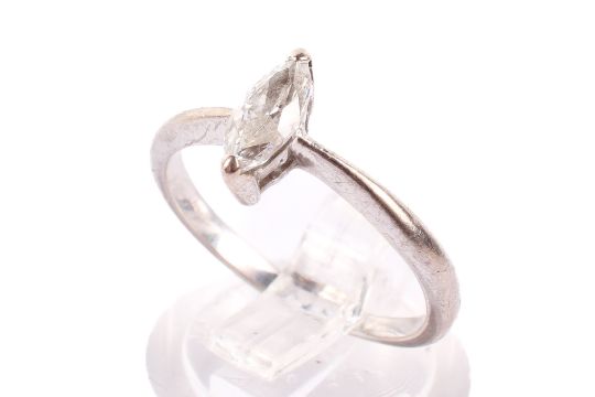 A white metal diamond solitaire ring. The faceted stone of marquise form, 7mm x 3mm, in an unmarked white metal setting, size M1/2, gross weight 2.5g.