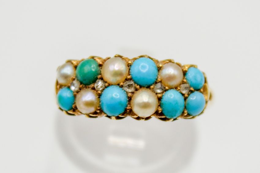 An 18ct gold pearl, turquoise and diamond ring. With five small old cut diamonds along the centre, metal marked 18 and with rubbed engraved dedication. Size Q, gross weight 4.37g.