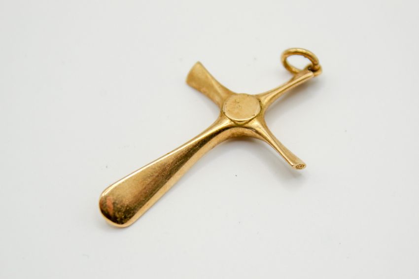 A 15ct gold propeller form cross pendant. Of elegant form, engraved 15ct to the two short ends, and with registration number, height without loop 3.5cm, gross weight 5g.