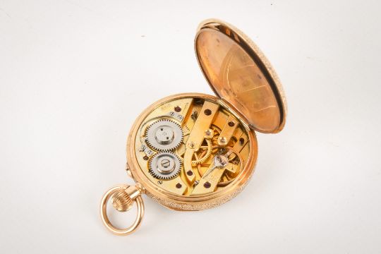 A lady's yellow metal pocket watch. The gilt dial having Roman numerals and decorated with flowers and foliage, in an engraved yellow metal case marked '14K', manual movement, case diameter 3.5cm, gross weight 38.0g.
