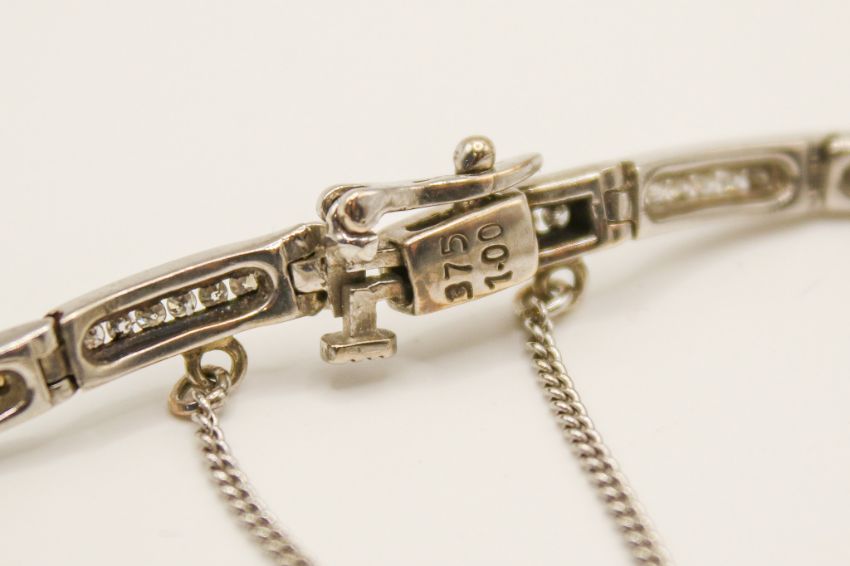 A 9ct white gold and diamond bracelet. The sixteen narrow panels each channel set with six small round cut diamonds, marked 375 and 1 for carat weight, with security chain. L18.5cm, gross weight 12.16g.