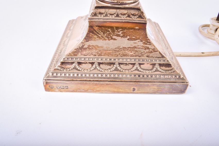 Tarnishing, minor wear and scratches to silver. Side of base drilled for cable. Glass is in good condition with no cracks or chips.