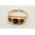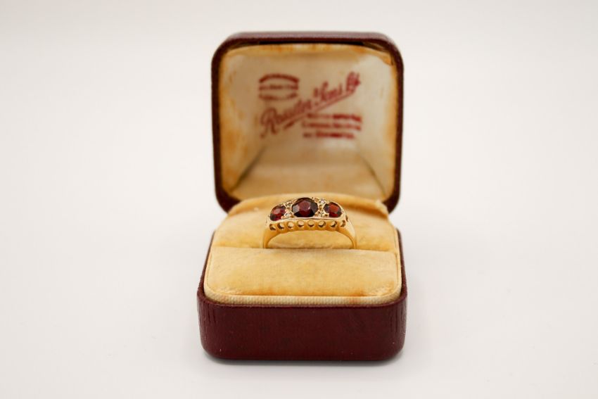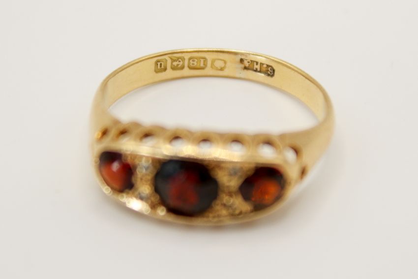 An 18ct gold and garnet three stone ring. In a pierced setting, the central stone circa 4.5mm diameter, hallmarked, gross weight 3g.